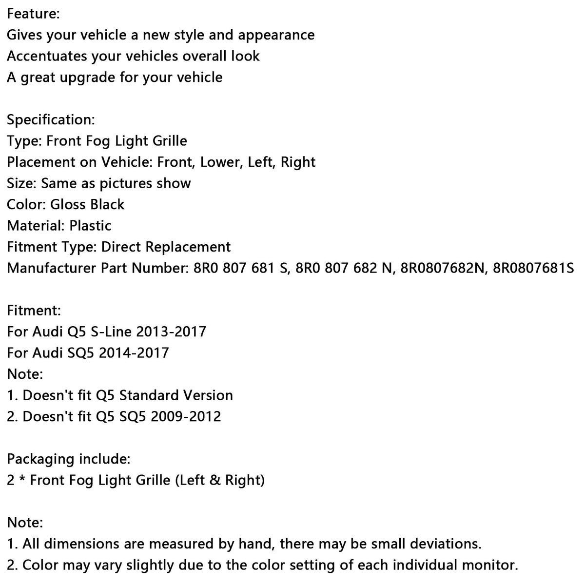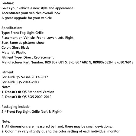 Frontstoßstange Nebelscheinwerfer Grill Grille Fit Audi Q5 S-Line SQ5 2013-2017 Schwarz