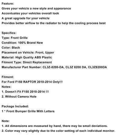 Frontstoßstangengrill CL3Z8200DA Passend für Ford F150 2010-2014 Raptor ohne Kameraloch