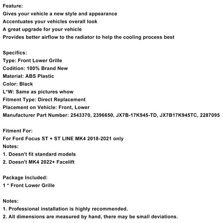 2018–2021 Ford Focus MK4 ST unterer Kühlergrill für die vordere Stoßstange, JX7B-17K945-TD 2543370