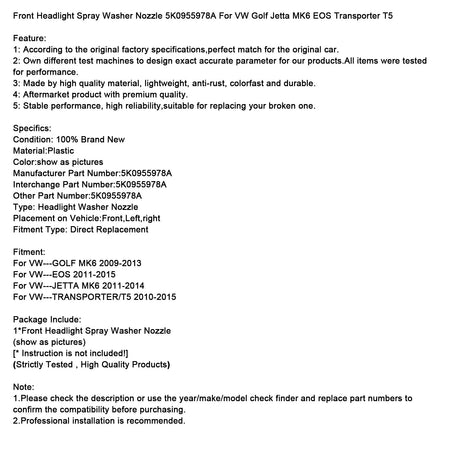 Frontscheinwerfer-Waschdüse 5K0955978A für VW Golf Jetta MK6 EOS Transporter T5