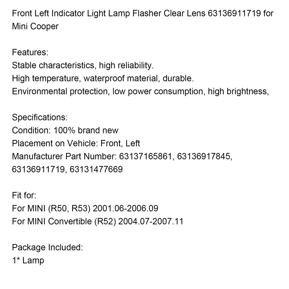 Vorne Links Blinker Lampe Blinker Klare Linse 63136911719 für Mini Cooper