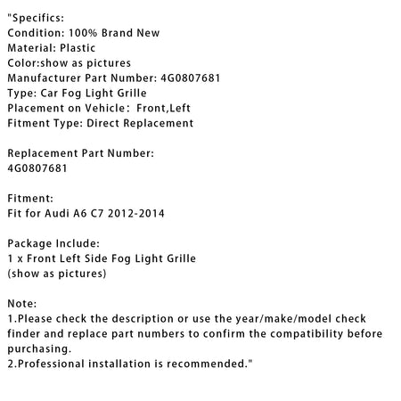 Vorne Links Seite Stoßstange Grille Nebel Licht Grill 4G0807681For Audi A6 C7 2012-2014