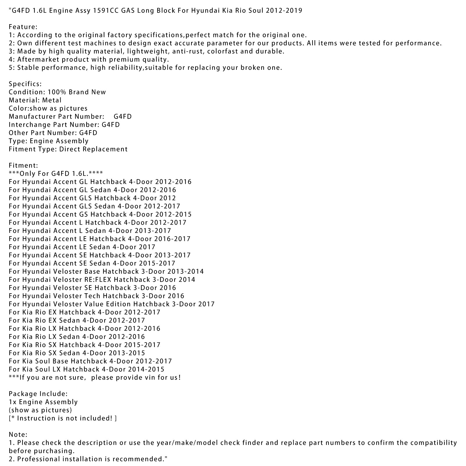 G4FD 1.6L Engine Assy 1591CC GAS Long Block For Hyundai Kia Rio Soul 2012-2019