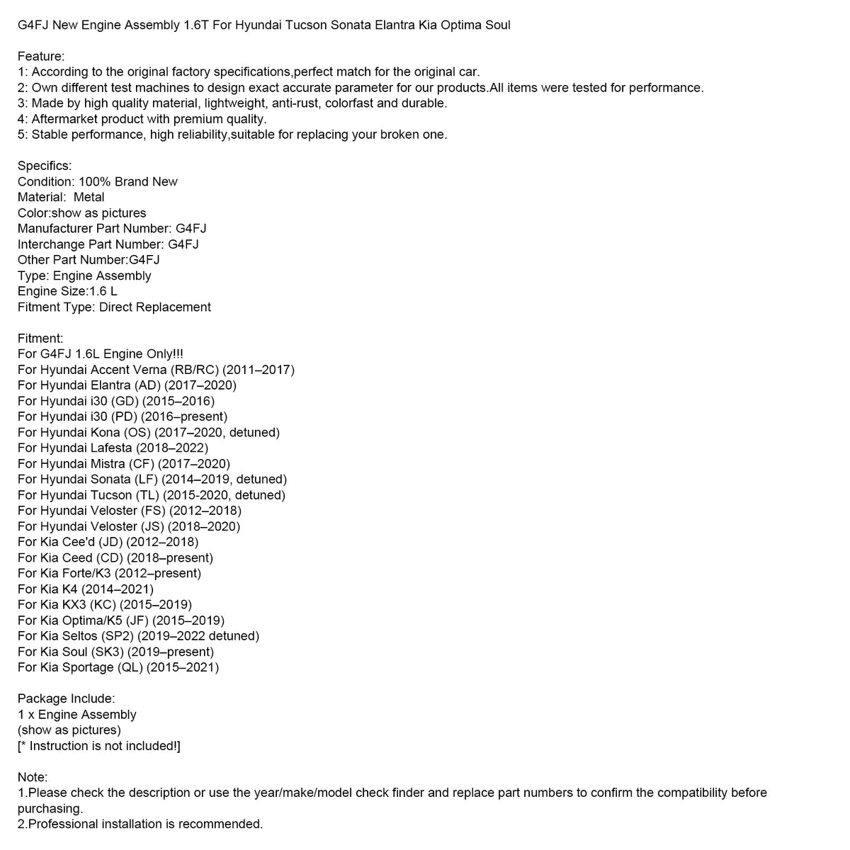 G4FJ New Engine Assembly 1.6T For Hyundai Tucson Sonata Elantra Kia Optima Soul