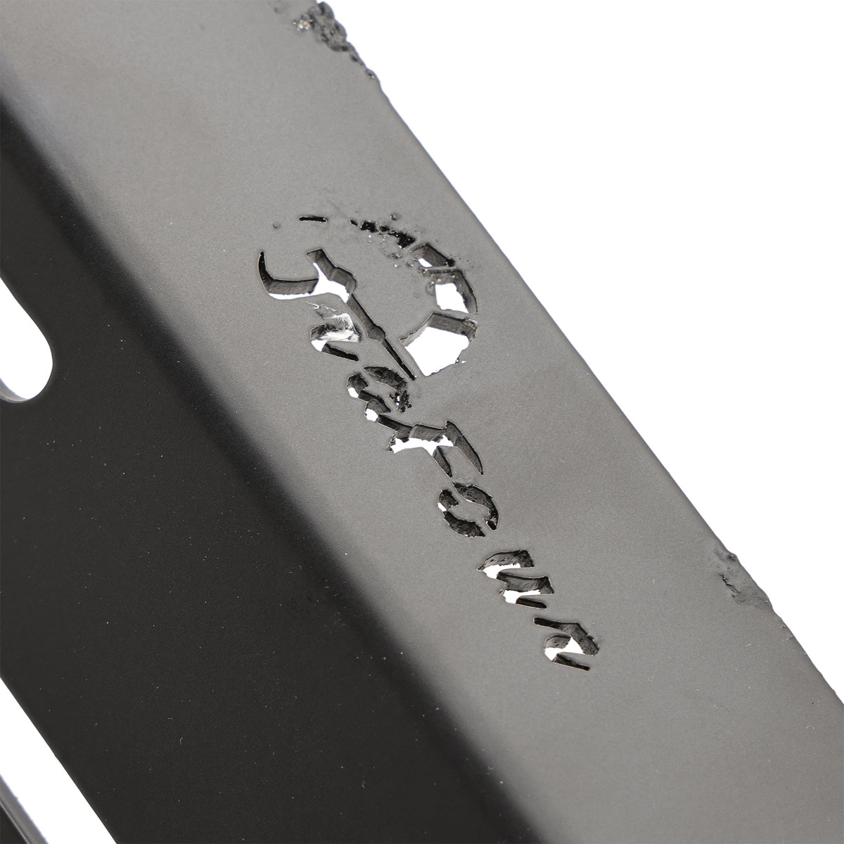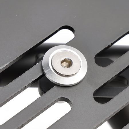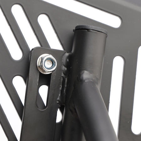 Gefertigt aus 3mm Aluminium, mit integrierten Schlitzen für Sicherheitsgurte, inkl. Befestigungsmaterial zur Montage an vorhandenen Gepäckträgern.