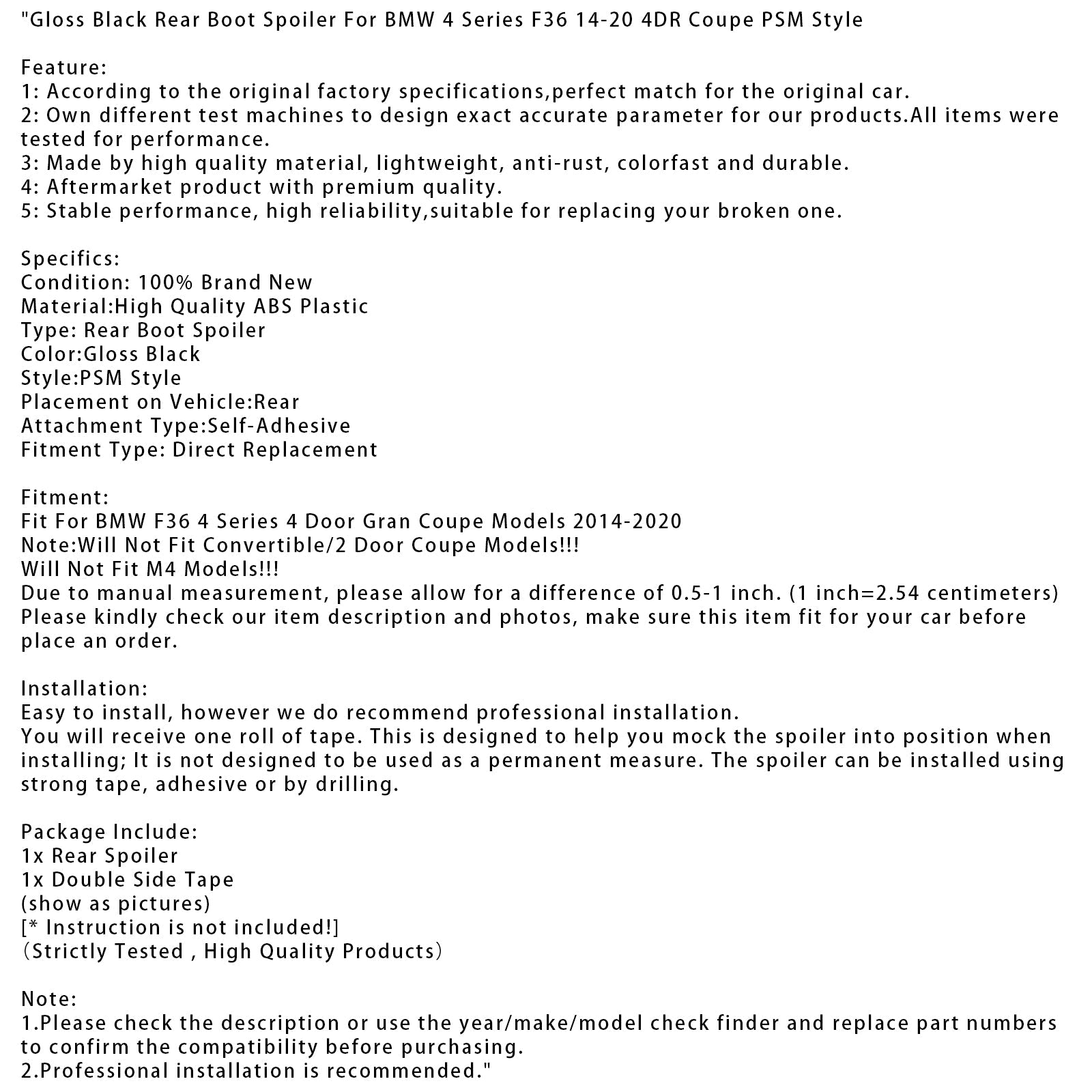 Heckspoiler in Hochglanzschwarz, passend für BMW 4er F36 Coupé (2014–2020), 4-Türer, PSM-Stil