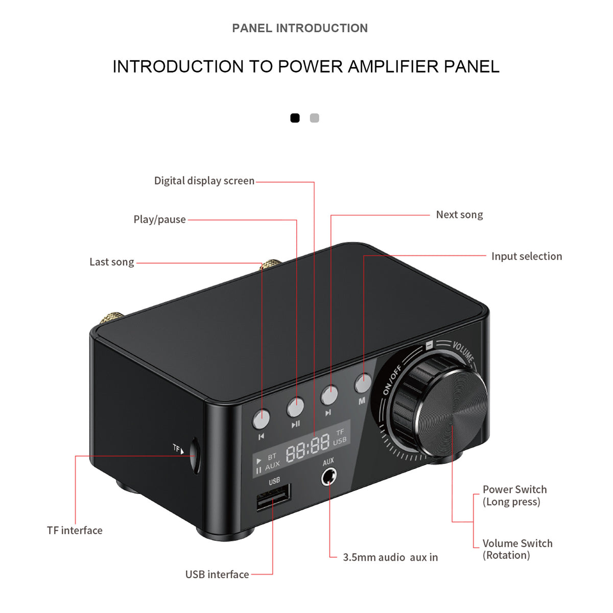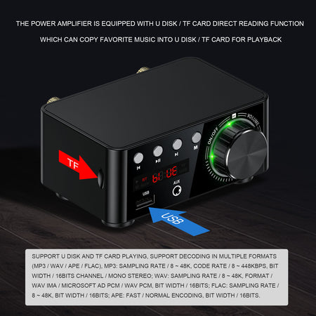 1. Als digitaler Leistungsverst?rker und Musikplayer unterstützt er RCA/AUX/USB/BT 5.0/TF-Karteneing?nge und ist nahezu kompatibel mit allen Heim-Audioger?ten wie Telefon, Tablet, Computer, Fernseher, Set-Box, CD-Player usw . U-Disk und TF-Karte unterstützen die verlustfreien Formate WAV, APE und FLAC.
