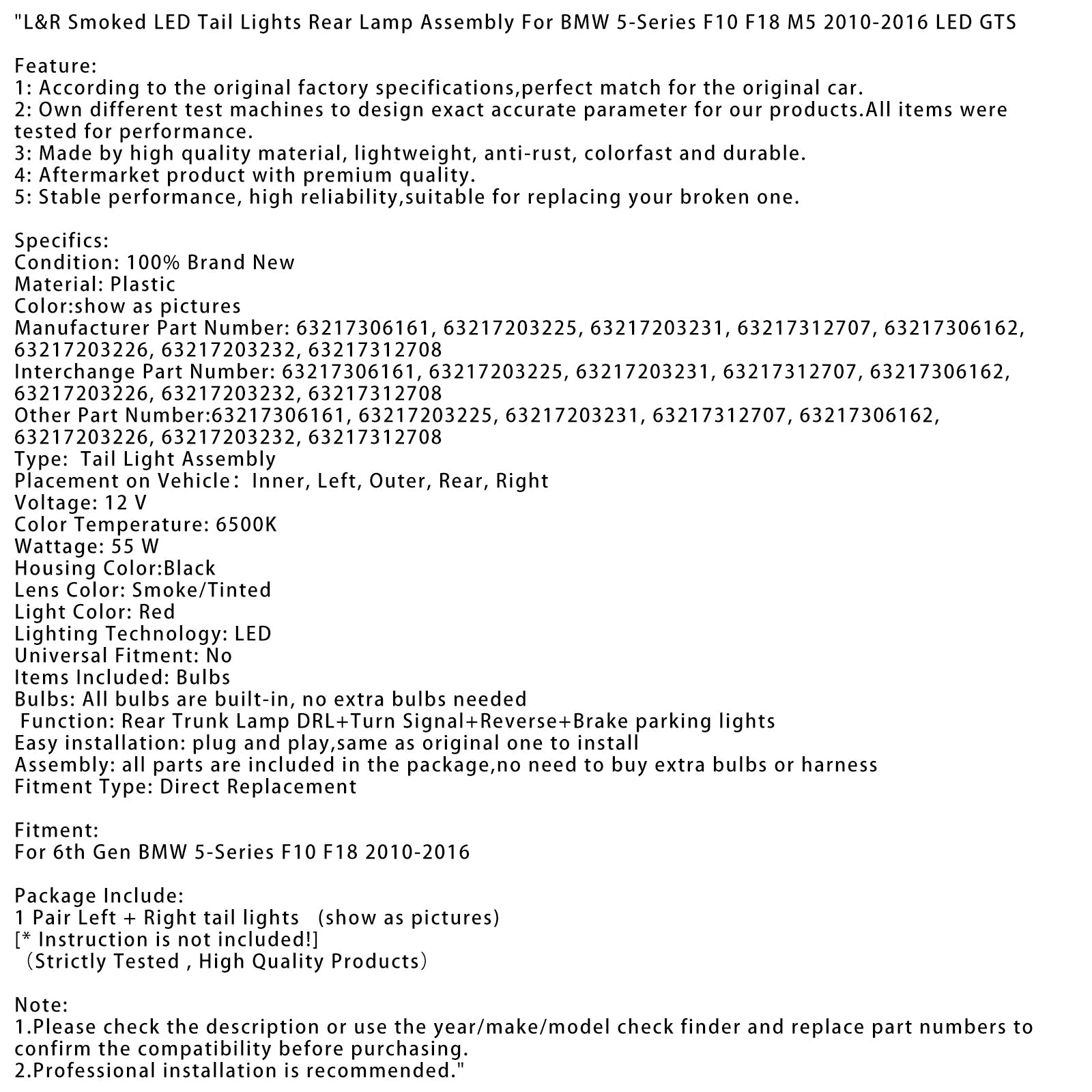 L&R Geräucherte LED Rückleuchten Hinten Lampe Montage Für BMW 5-Serie F10 F18 M5 2010-2016 LED GTS