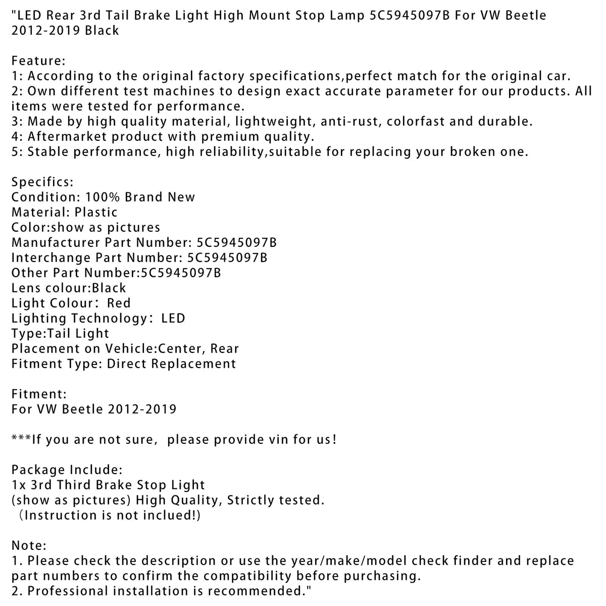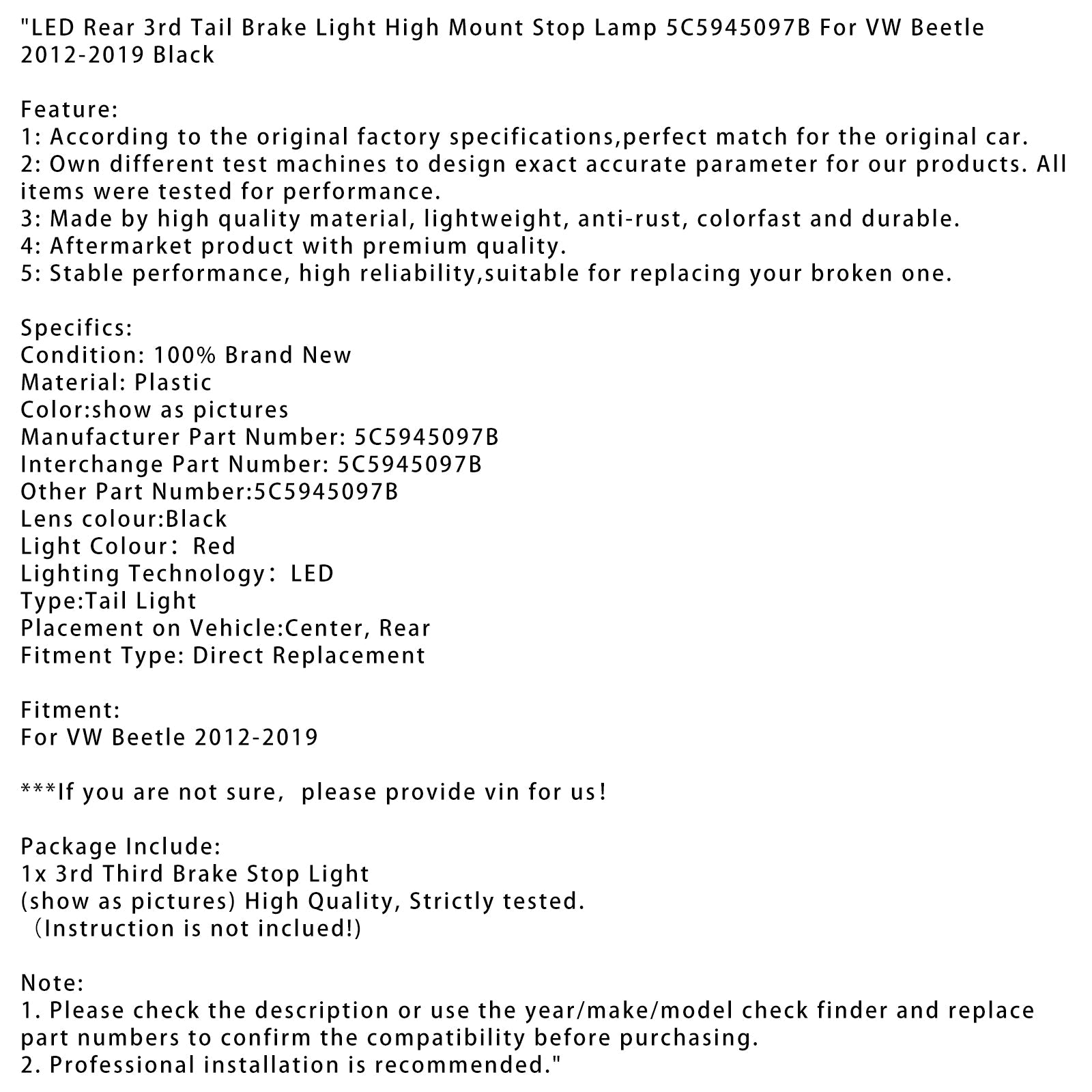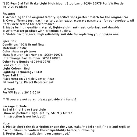 2012-2019 VW Beetle LED Hinten 3. Schwanz Bremse Licht Hoch Montieren Stop Lampe 5C5945097B