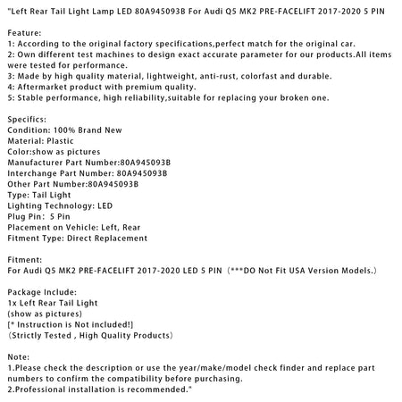 Linke LED-Rückleuchte 80A945093B für Audi Q5 MK2 (Vor-Facelift) 2017–2020, 5-polig