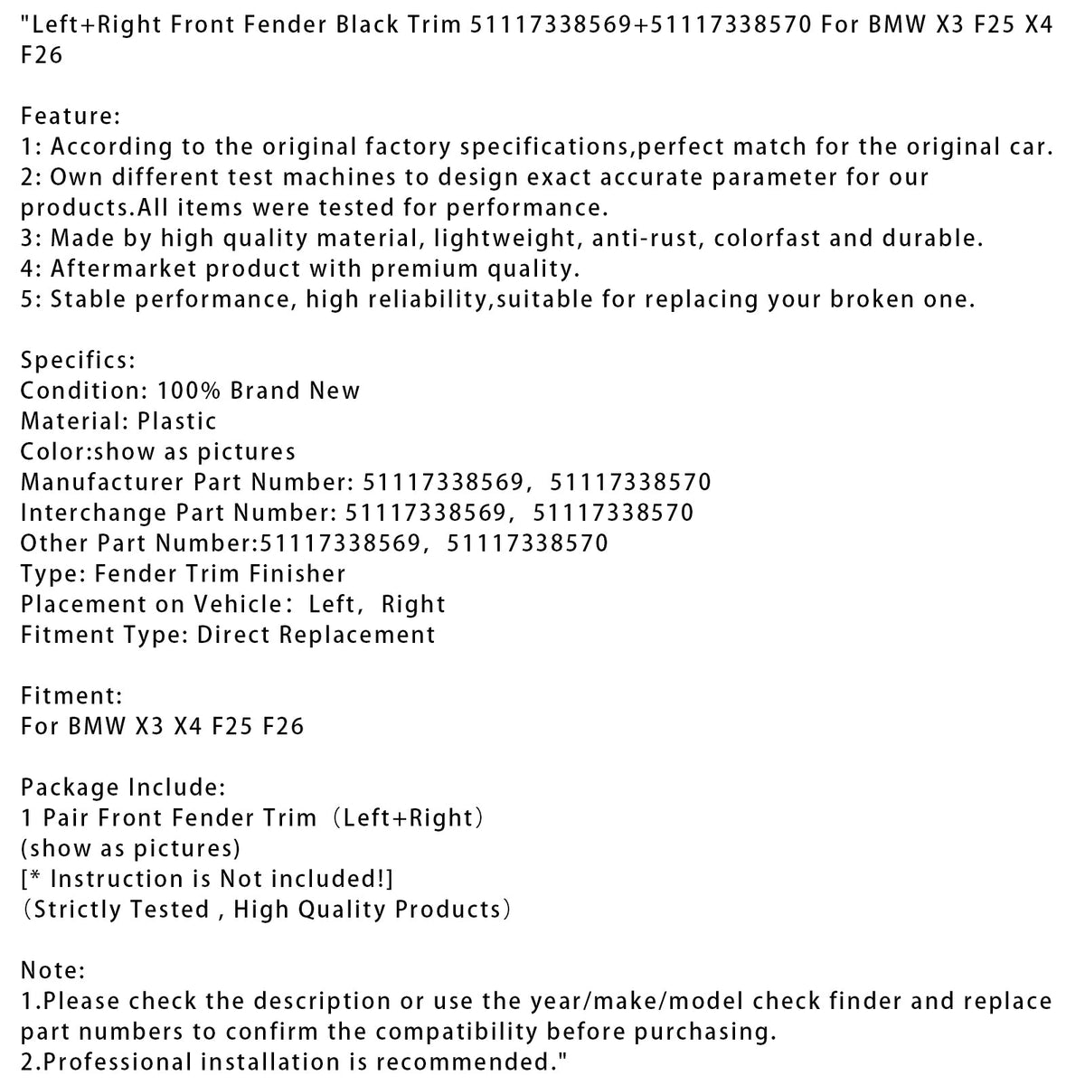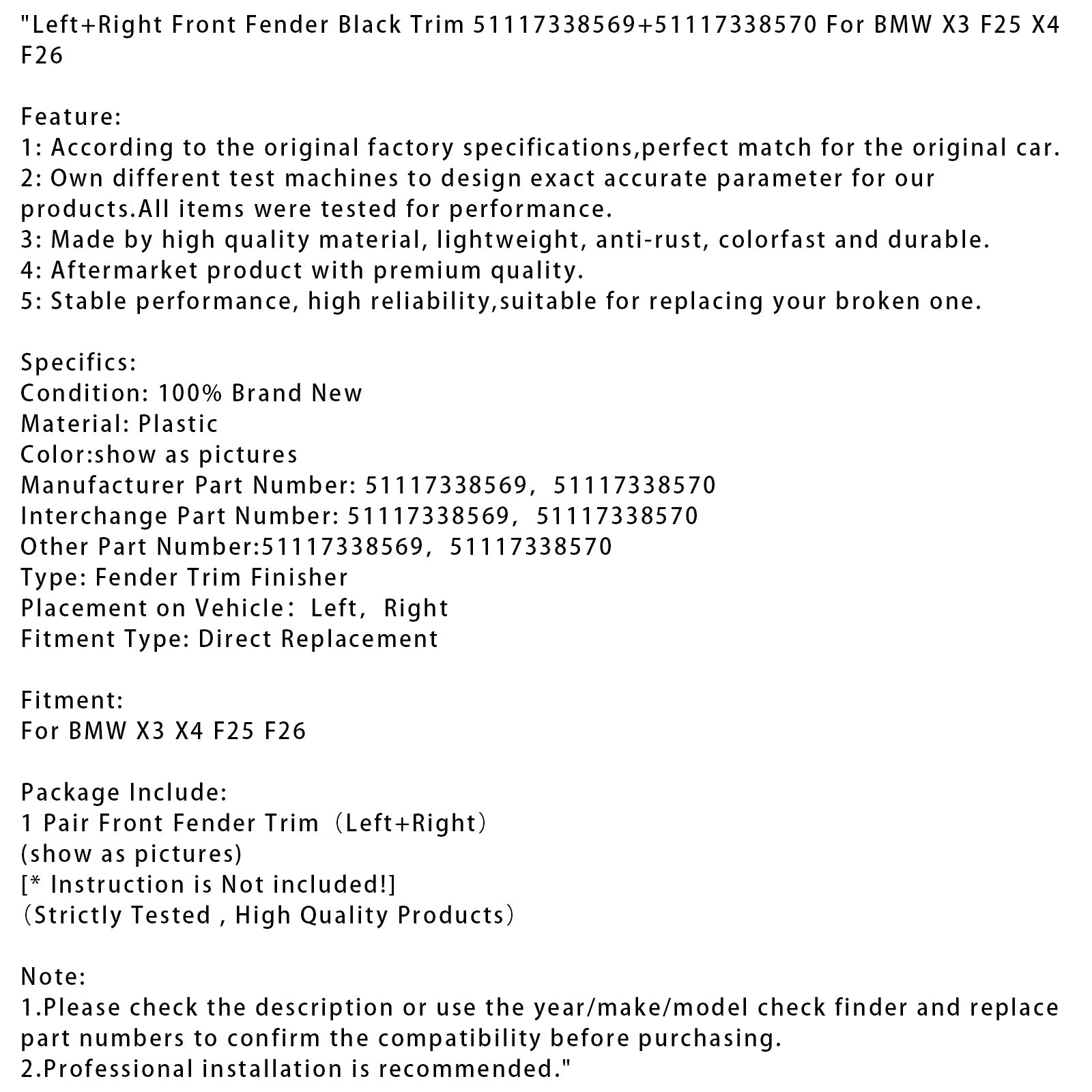 BMW X3 F25 X4 F26 Kotflügel vorne links + rechts, schwarze Zierleiste 51117338569 + 51117338570