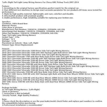 Links + Rechts Rücklicht Lampe Kabelbaum Für Chevy GMC Pickup Truck 2007-2014