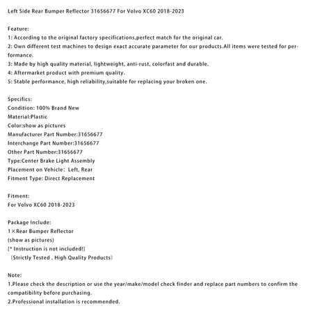 Linker hinterer Stoßstangenreflektor 31656677 Passend für Volvo XC60 2018-2023