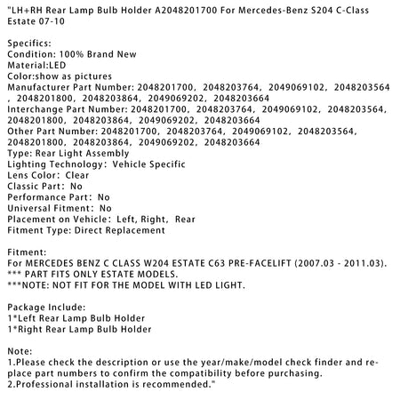 LH + RH Hinten Lampe Birne Halter A2048201700 Für Mercedes-Benz S204 C-Klasse Kombi 07-10