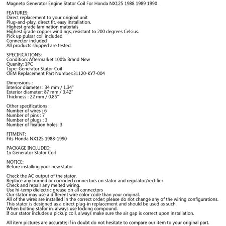 Magnetengenerator Statorspule für Honda NX125 31120-ky7-004 1988 1989 1990 Generika