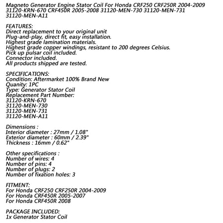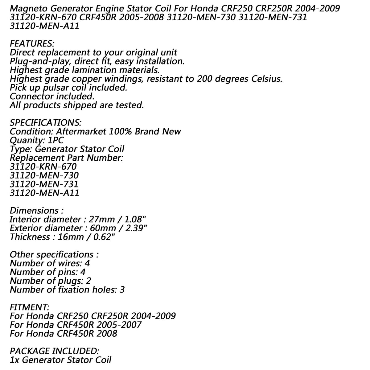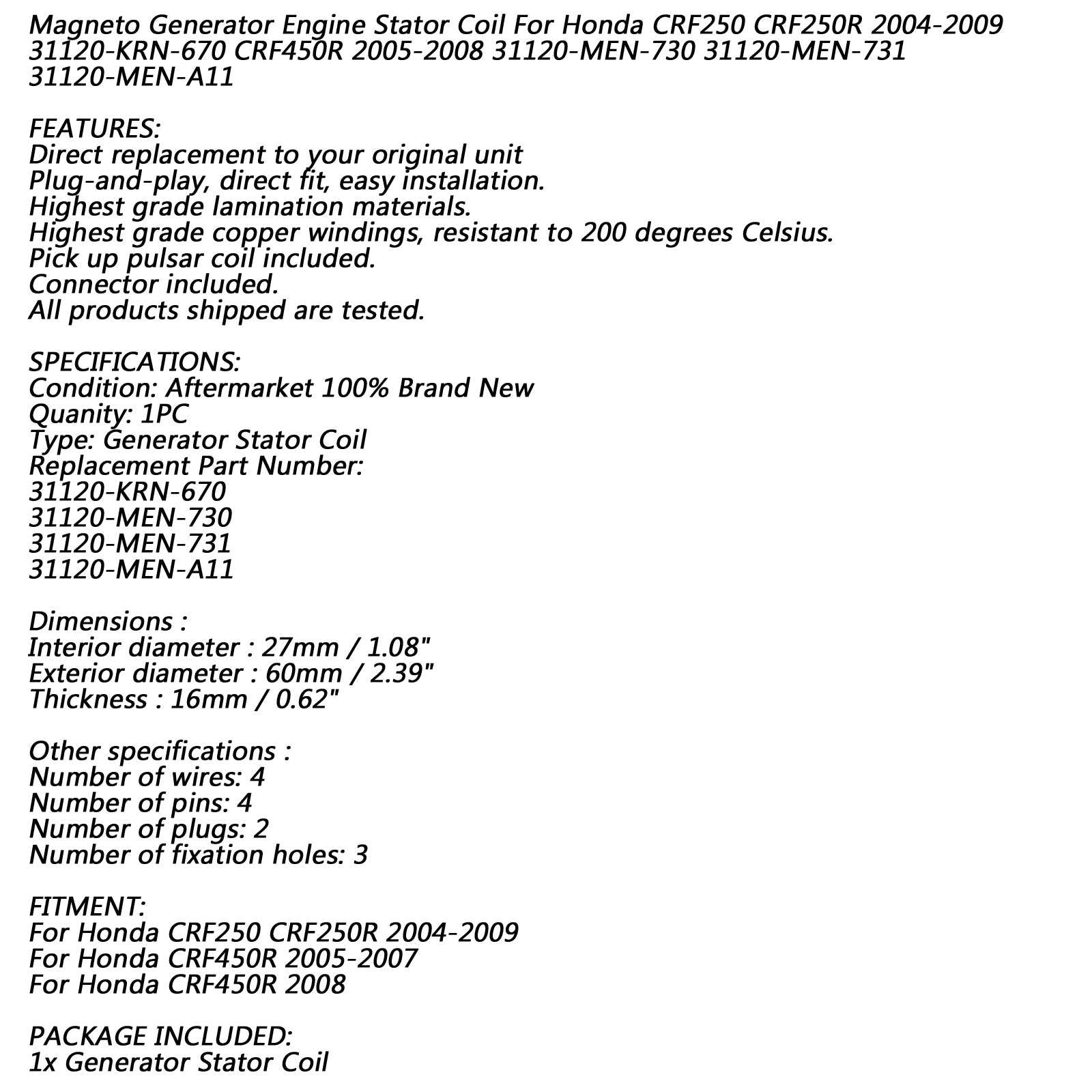 MAGNETO-Generatormotor-Statorspule für Honda CRF250 CRF250R 2004-2009 31120-KRN-670 CRF450R 2005-2008 31120-MEN-730 31120-MEN-731 31120-MEN-A11