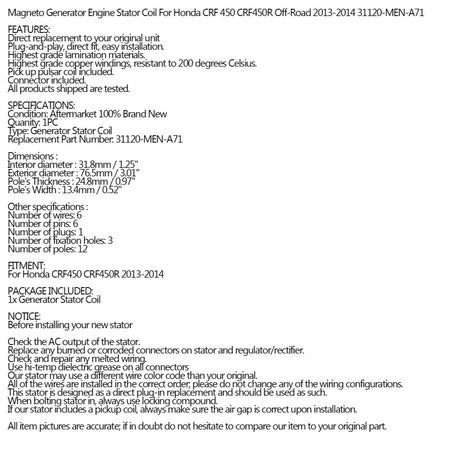Motorzündungsstator Lichtmaschine Passend für Honda CRF 450 R CRF450R 2013-2014 Ersatz # 31120-MEN-A71
