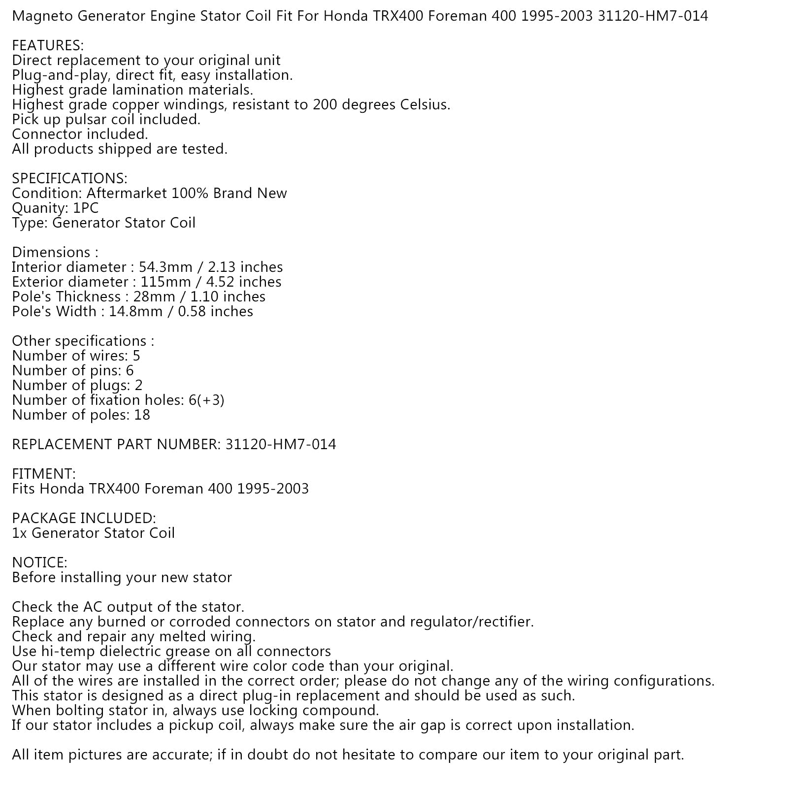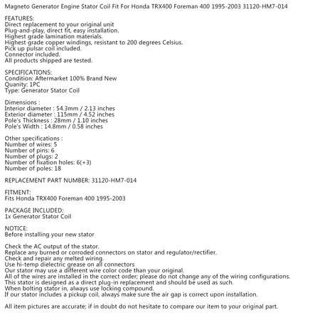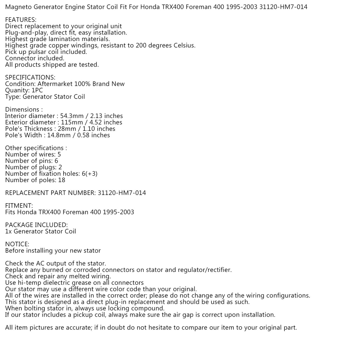 Generator Magneto Stator für Honda TRX 400 FW 4x4 Foreman 400 ATV 1995-2003 Generika