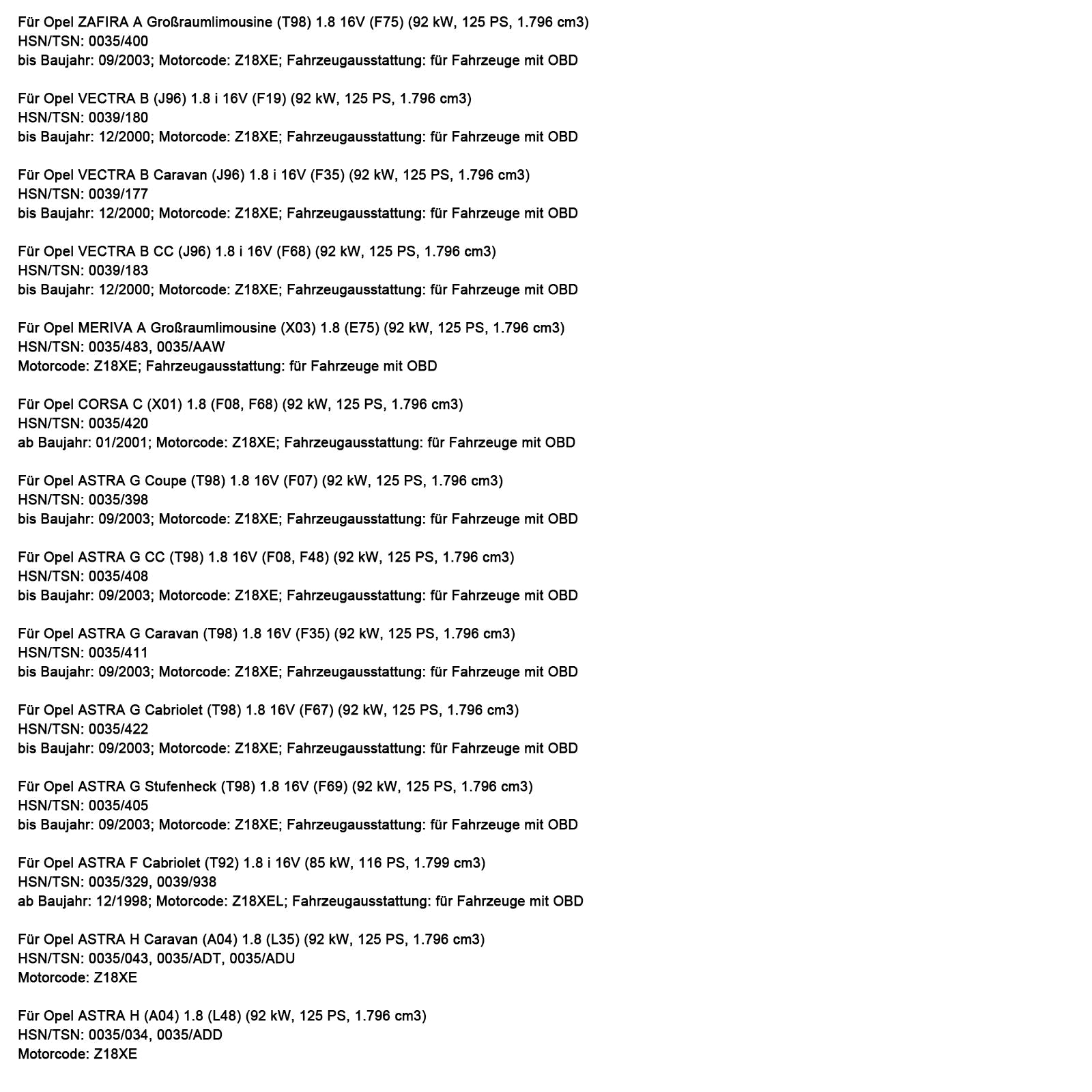bis Modelljahr: 09/2003; Motorcode: Z18XE; Fahrzeugausstattung: für Fahrzeuge mit OBD