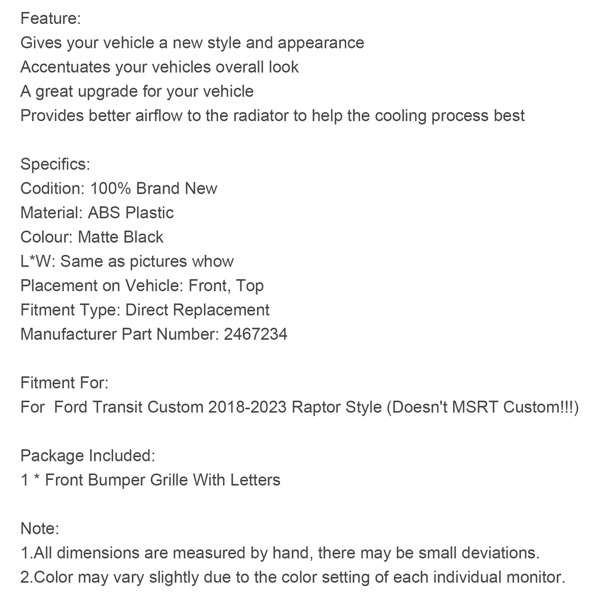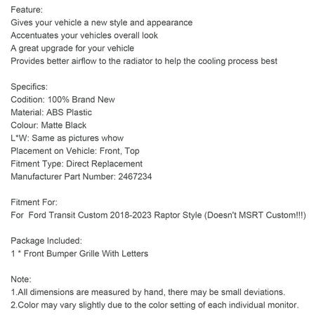 For Ford Transit Custom 2018-2023 Raptor Style (Doesn't MSRT Custom!!!)
