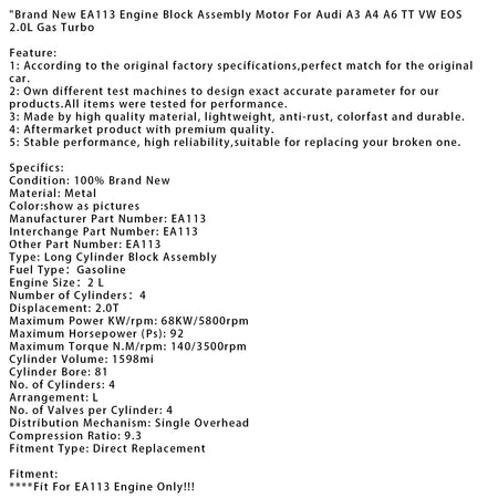 Neuer EA113 Motorblock für Audi A3, A4, A6, TT und VW EOS 2.0L Benzin-Turbomotor