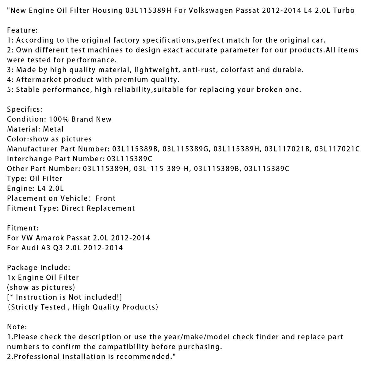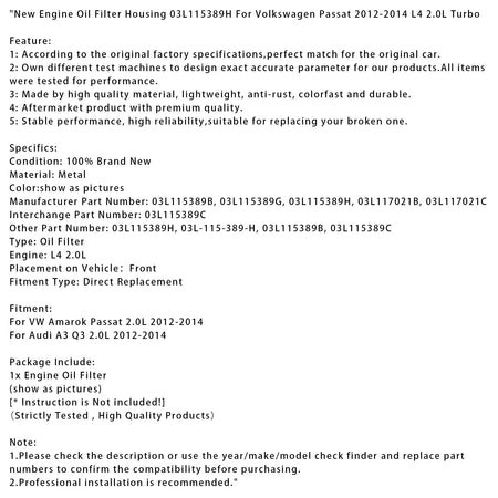 Neues Motorölfiltergehäuse 03L115389H passend für Volkswagen Passat 2012-2014 L4 2.0L Turbo