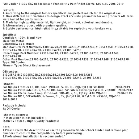Oil Cooler 21305-EA21B For Nissan Frontier NV Pathfinder Xterra 4.0L 5.6L 2008-2019