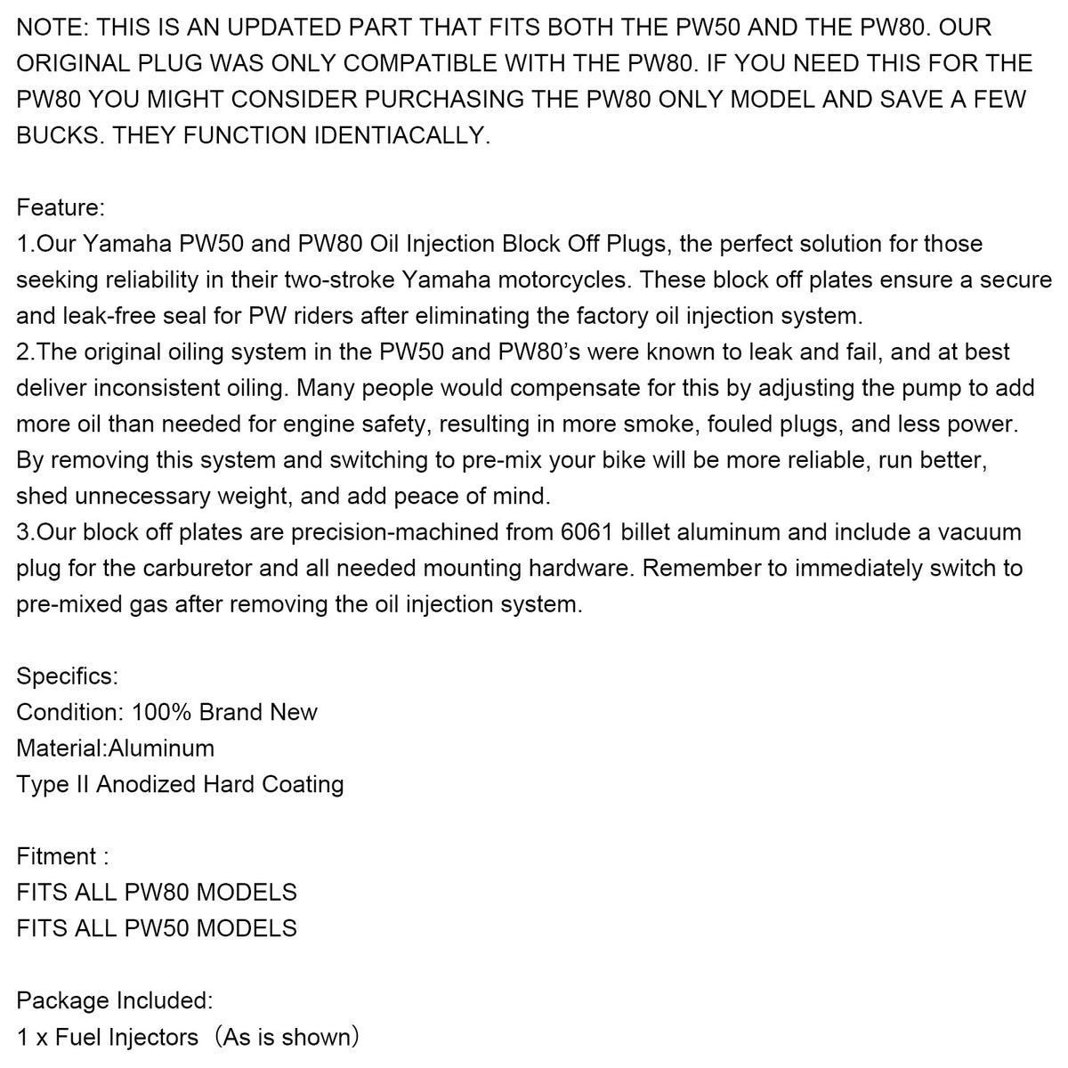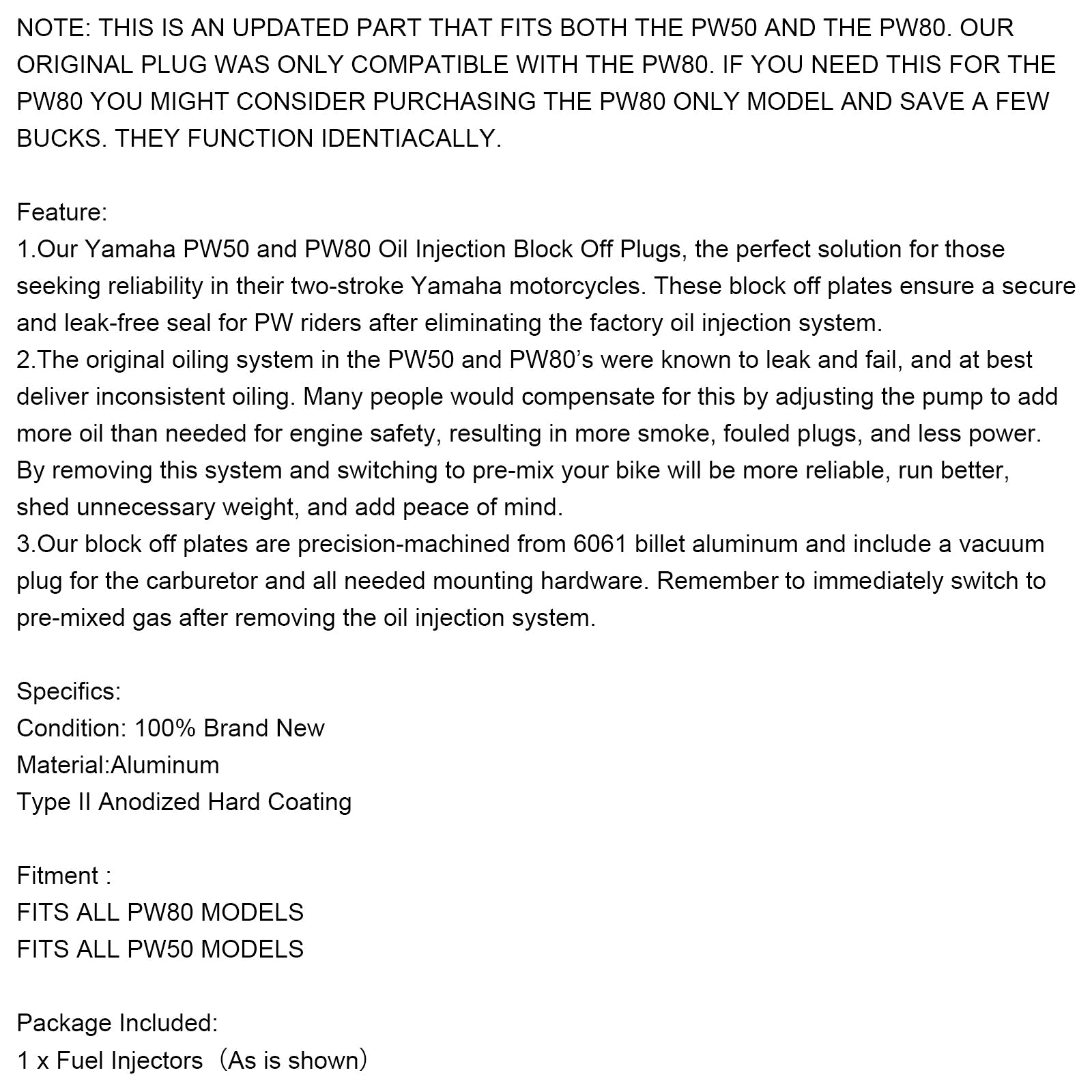 1. Unsere ?leinspritz-Blockierstopfen für Yamaha PW50 und PW80 sind die perfekte L?sung für alle, die Zuverl?ssigkeit bei ihren Zweitakt-Motorr?dern von Yamaha suchen. Diese Blockierplatten gew?hrleisten eine sichere und leckagefreie Abdichtung für PW-Fahrer nach dem Entfernen des werkseitigen ?leinspritzsystems.