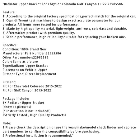 Obere Kühlerhalterung passend für Chrysler Colorado und GMC Canyon (2015–2022), Teilenummer 22985586