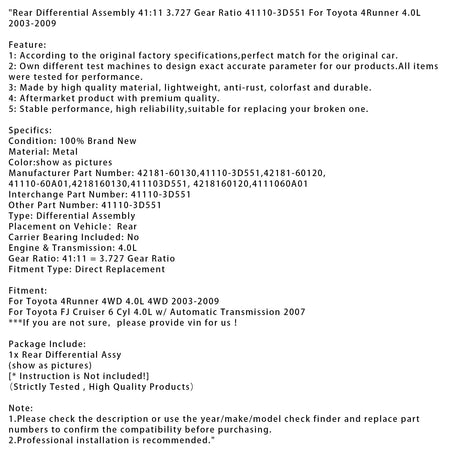 Hintere Differentialbaugruppe 41:11 3,727 Übersetzungsverhältnis 41110-3D551 Für Toyota 4Runner 4.0L 2003-2009