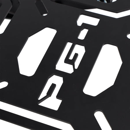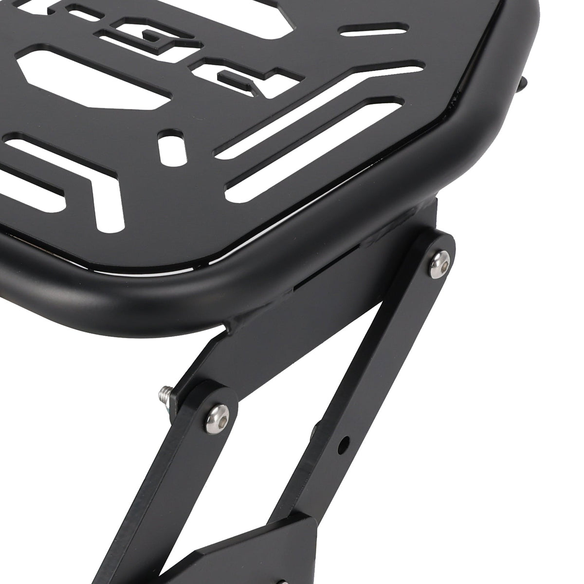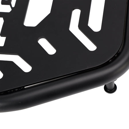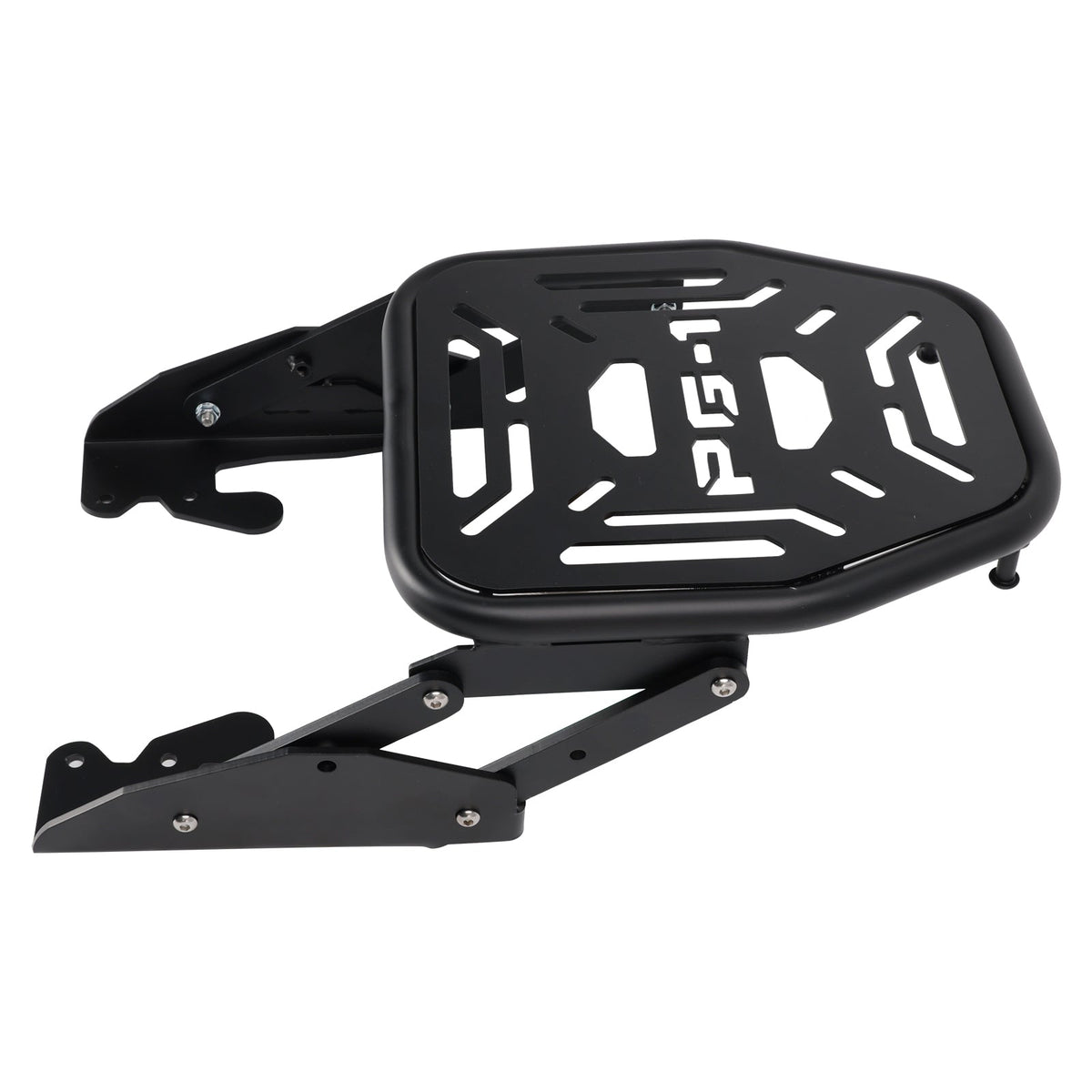 Zusammenklappbarer Gepäckträger für PG1 aus dickem Stahl, fein verarbeitet, mit eingraviertem PG-1-Logo auf der Oberfläche und Löchern zur Befestigung verschiedener Arten von praktischen Boxen.