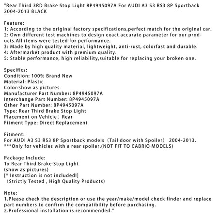 Hinten Dritte 3RD Bremse Stop Licht 8P4945097A Für AUDI A3 S3 RS3 8P Sportback 2004-2013 SCHWARZ