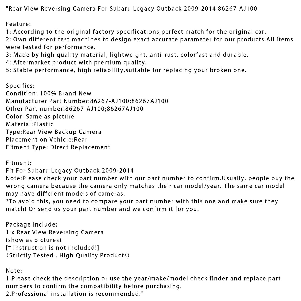 Rückfahrkamera für Subaru Legacy und Outback (2009–2014), Teilenummer 86267-AJ100