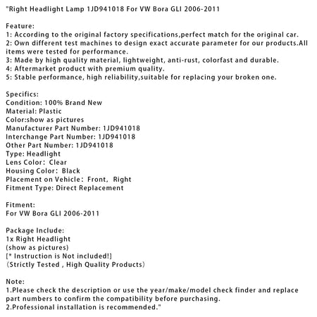 2006-2011 VW Bora GLI Rechte Scheinwerferlampe 1JD941018