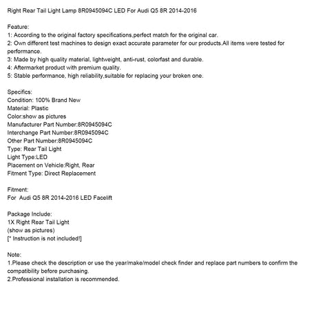 Rechts Hinten Schwanz Licht Lampe LED für Audi Q5 8R (2014-2016) - 8R0945094C