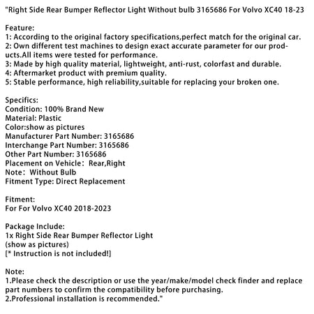 Rechte Seite Hecksto?stangenreflektorlicht ohne Glühbirne passend für Volvo XC40 18-23 3165686
