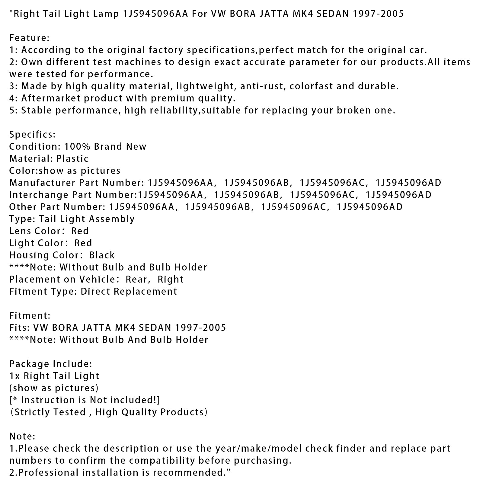 1997–2005 VW Bora Jatta MK4 Limousine Rechte Rückleuchte 1J5945096AA 1J5945096AB