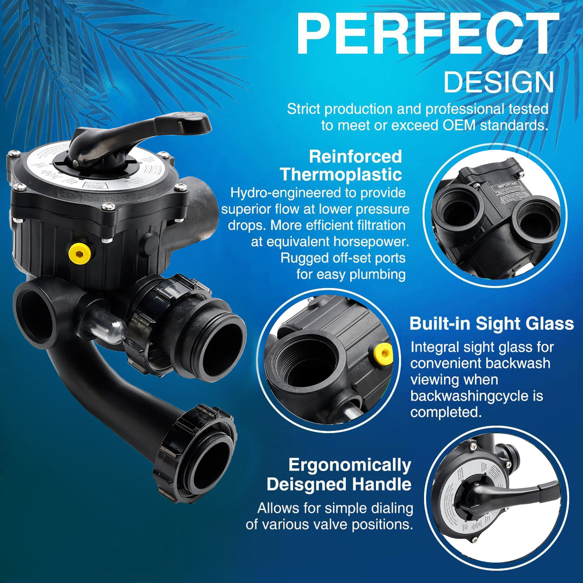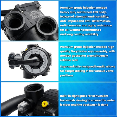 Das hochwertige Mehrwegeventil bietet 6 Positionen: Filtern, Rückspülen, Spülen, Entleeren, Geschlossen, Umw?lzen. Dank ergonomischem Hebelgriff ist die Bedienung besonders benutzerfreundlich. Integriertes Sichtfenster erm?glicht die Rückspülkontrolle auf einen Blick.