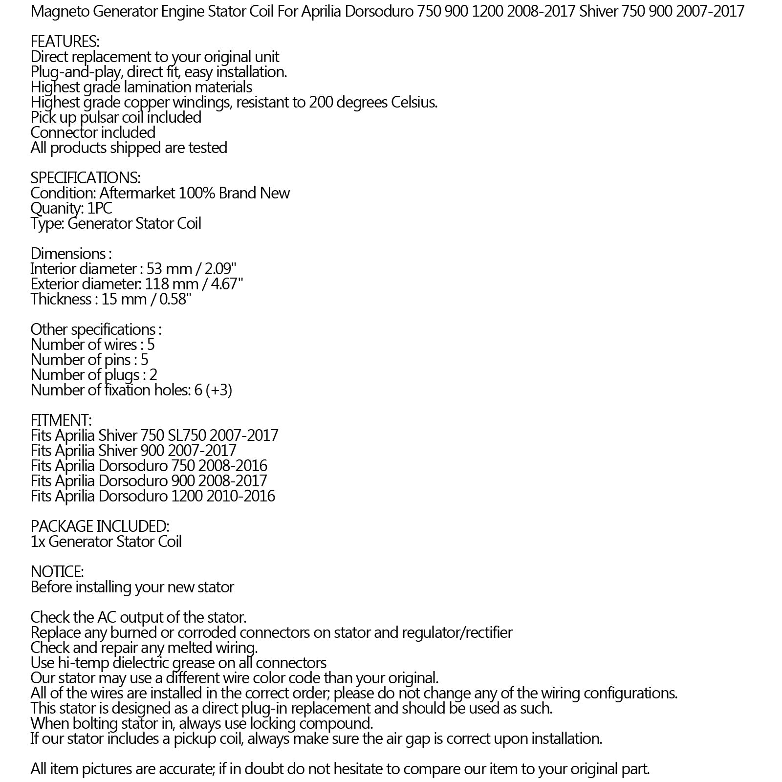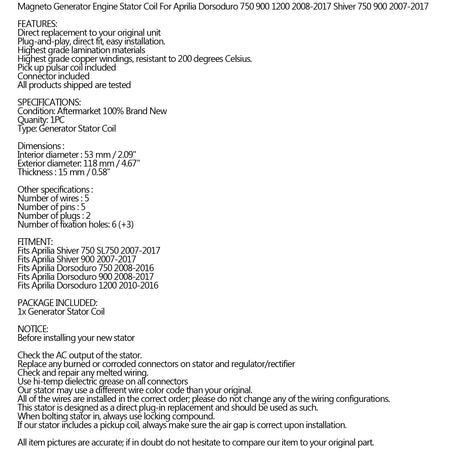 Statorgenerator für Aprilia Dorsoduro 750 900 1200 Shiver 750 900 2007-2017 Generika
