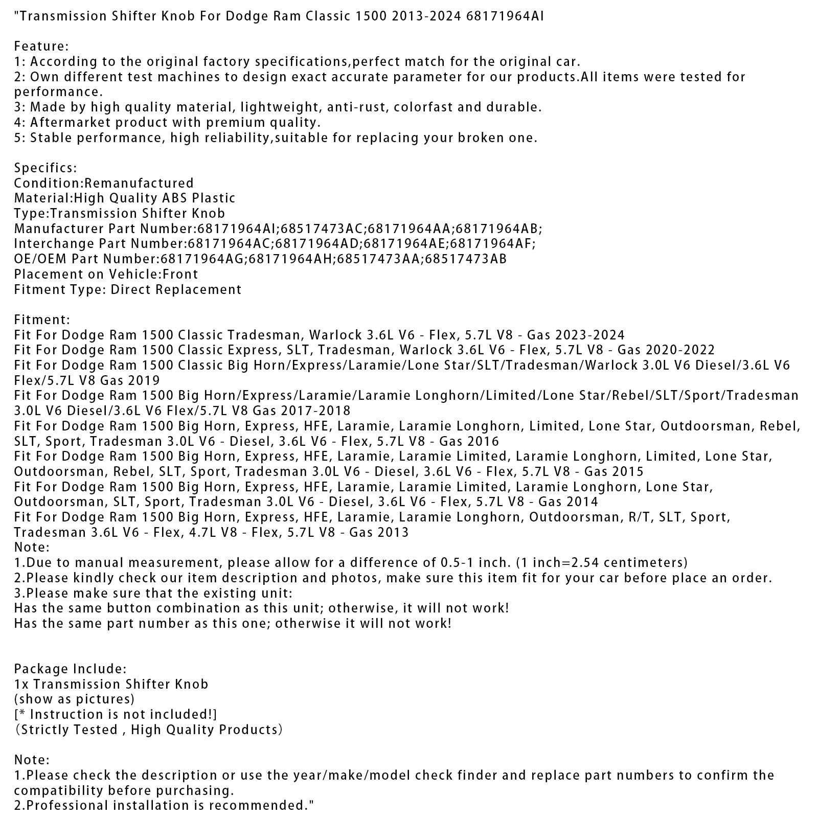 Schaltknauf passend für Dodge Ram Classic 1500 (2013–2024), Teilenummer 68171964AI