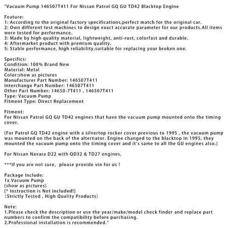 Für Nissan Patrol GQ GU TD42 Motoren, bei denen die Vakuumpumpe am Steuergehäusedeckel montiert ist.