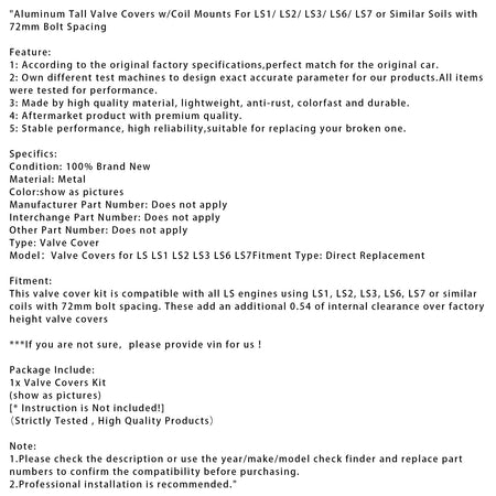 Hohe Ventildeckel aus Aluminium mit Zündspulenhalterungen für LS1/ LS2/ LS3/ LS6/ LS7 oder ähnliche Motoren mit 72 mm Schraubenabstand