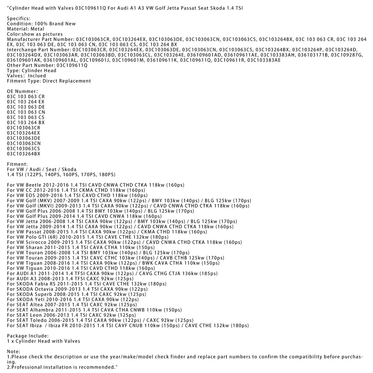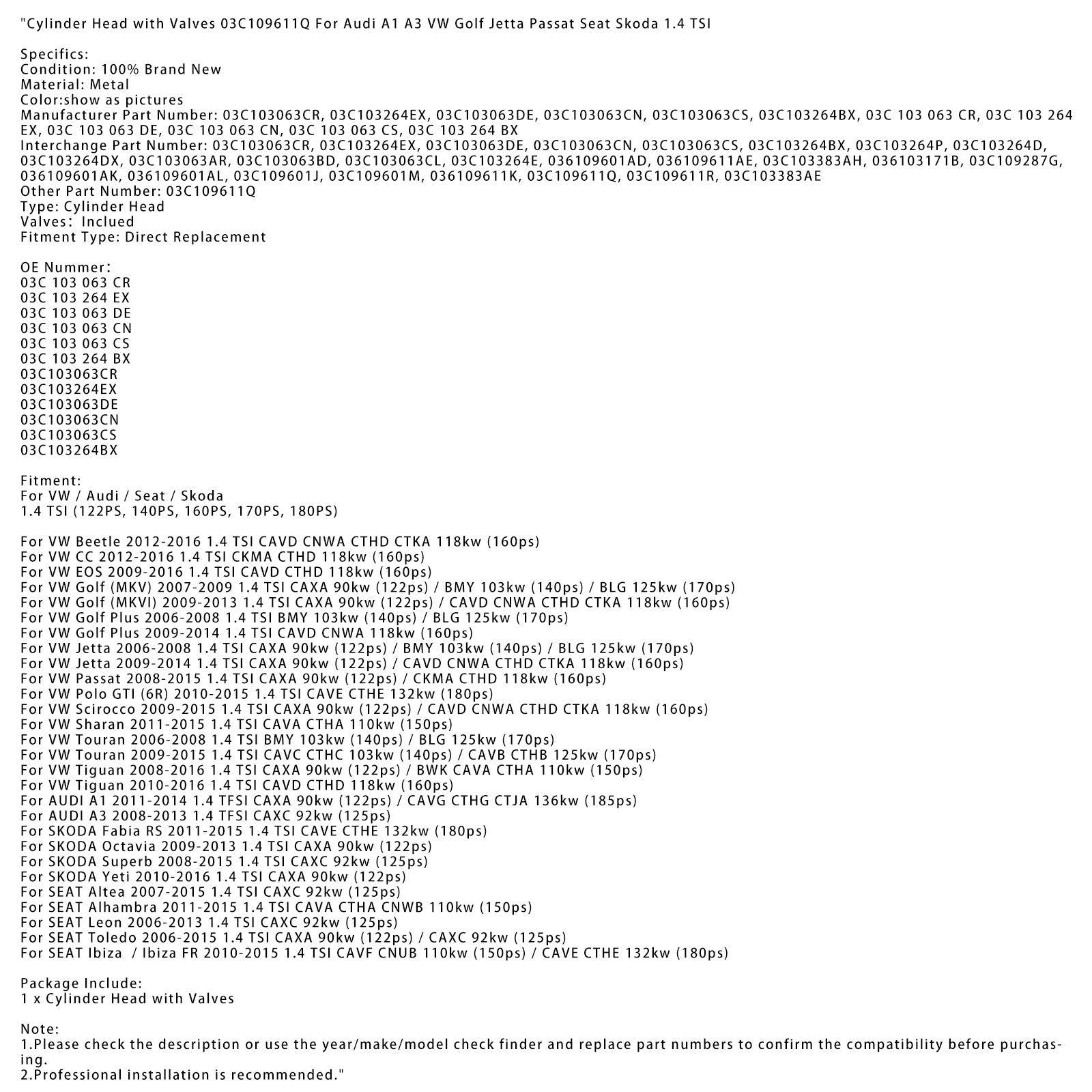 Zylinderkopf mit Ventilen 03C109611Q für Audi A1 A3 VW ForGolf Jetta Passat Seat Skoda 1.4 TSI