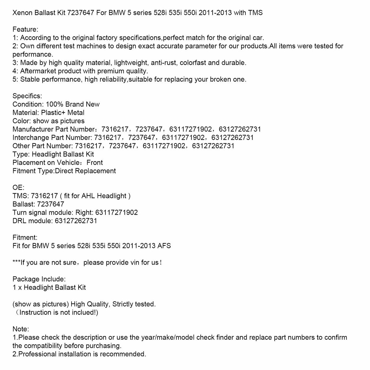 1. Bitte überprüfen Sie vor dem Kauf die Beschreibung oder verwenden Sie die Baujahr-/Marken-/Modellsuchfunktion und ersetzen Sie die Teilenummern, um die Kompatibilit?t zu best?tigen.