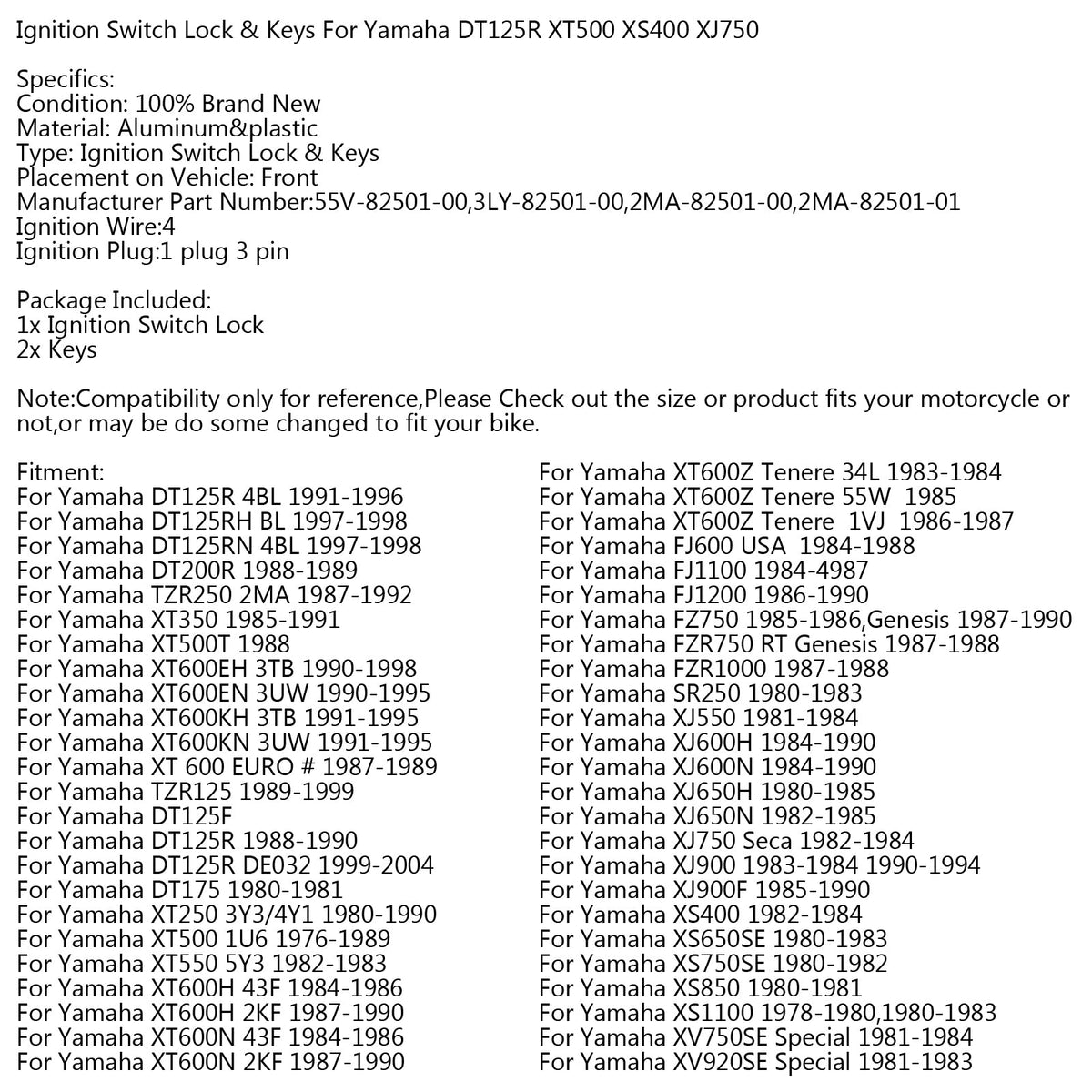 Zündschalter -Sperrschlüsse für Yamaha DT125R XT600KN TZR250 FJ600 XJ750 Generic